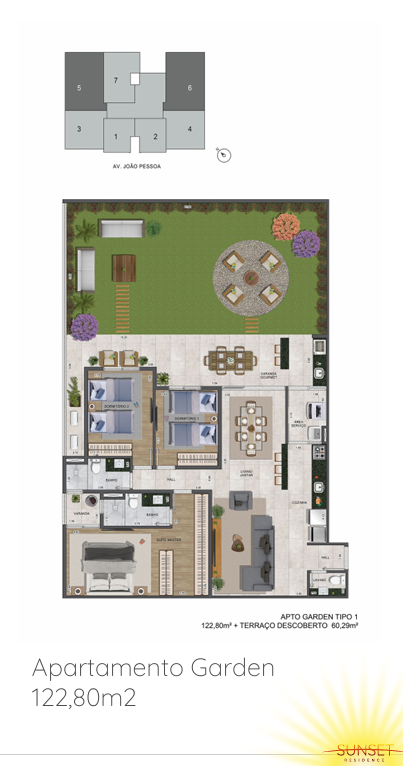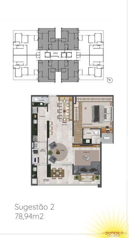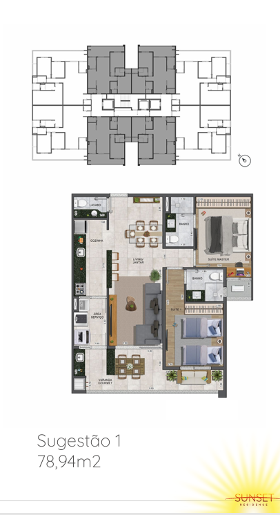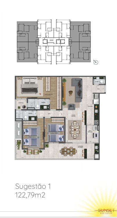 Apartamentos: O Sunset Residence possui opções de apartamentos de 78,94 m² (2 dormitórios) e 122,79 m² (3 dormitórios), além de unidades Garden, com áreas de lazer privativas. As plantas são flexíveis, permitindo personalizações conforme as necessidades dos moradores .